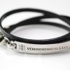PARKINSONIA sairastavalle kolme kertaa ranteen ympäri kieputettava, musta nahkarannekoru. Tekstilaatan koko on 45x10mm, teksti on lasermerkattu (laatta kapenee aavistuksen toista reunaa kohti). Koru kiinnitetään rapulukolla. Metalliosat ovat kestävää ruostumatonta terästä ja laadukas nahkanauha on noin 5 mm leveä.