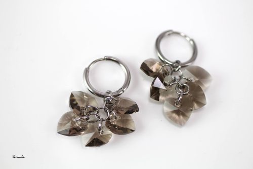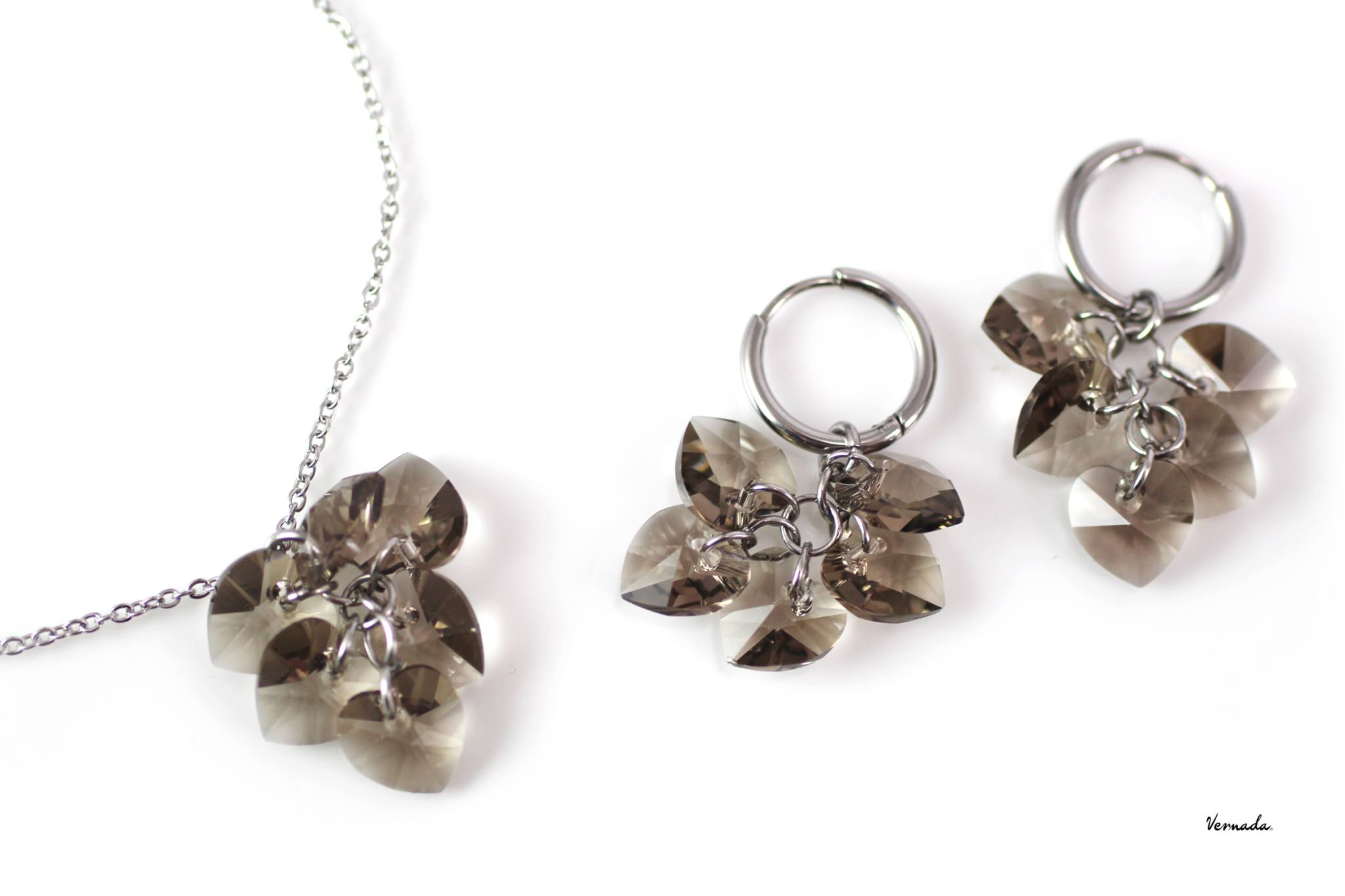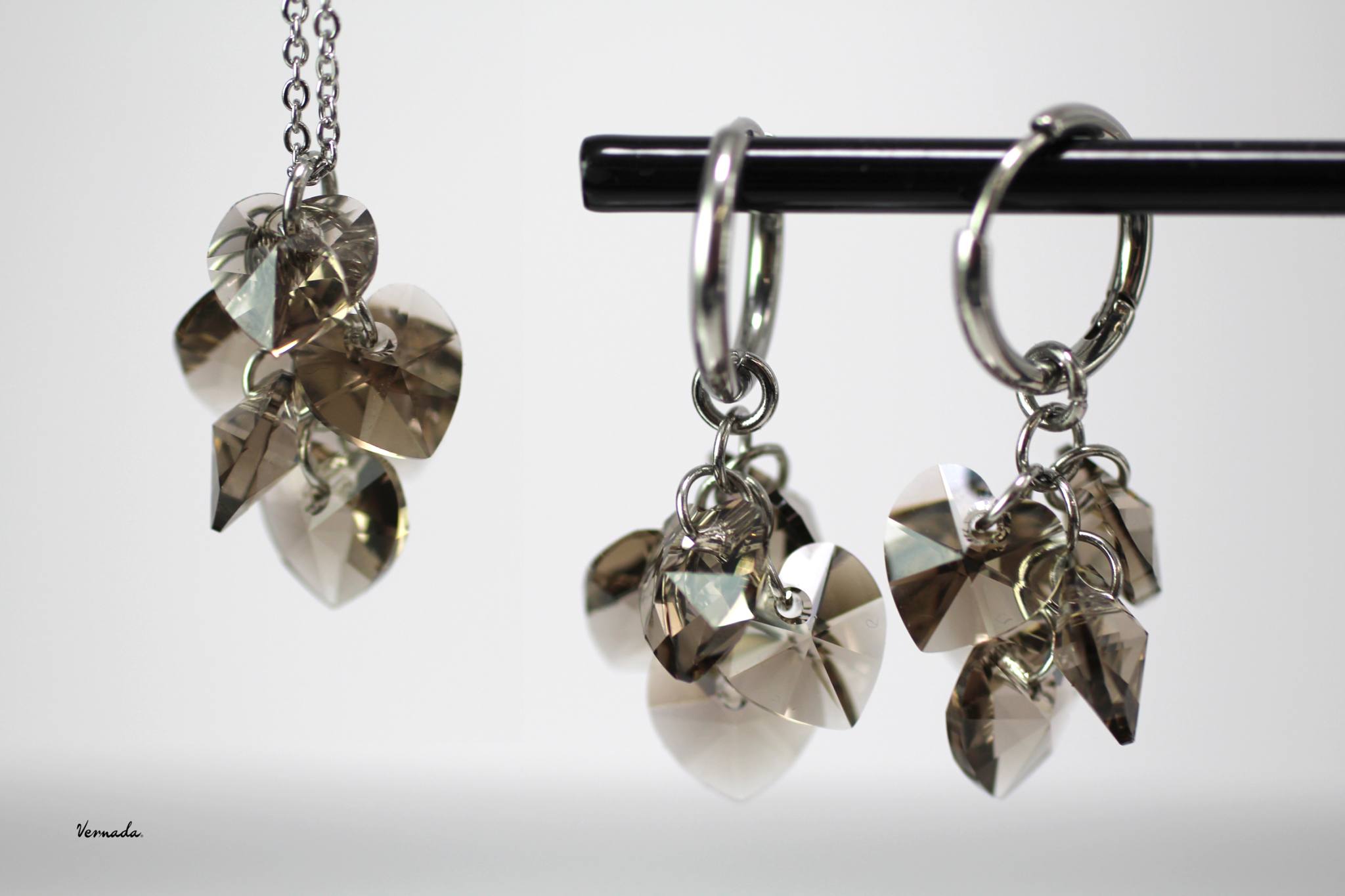 Ihastuttava korusetti, jossa sekä kaulaketju, että samansarjan korvakorut. Koruissa on savun harmaista Swarovski-kristallisydämistä tehdyt rypäsriipukset, jotka voi irroittaa korvarenkaista. Renkaita voi käyttää myös sellaisenaan.