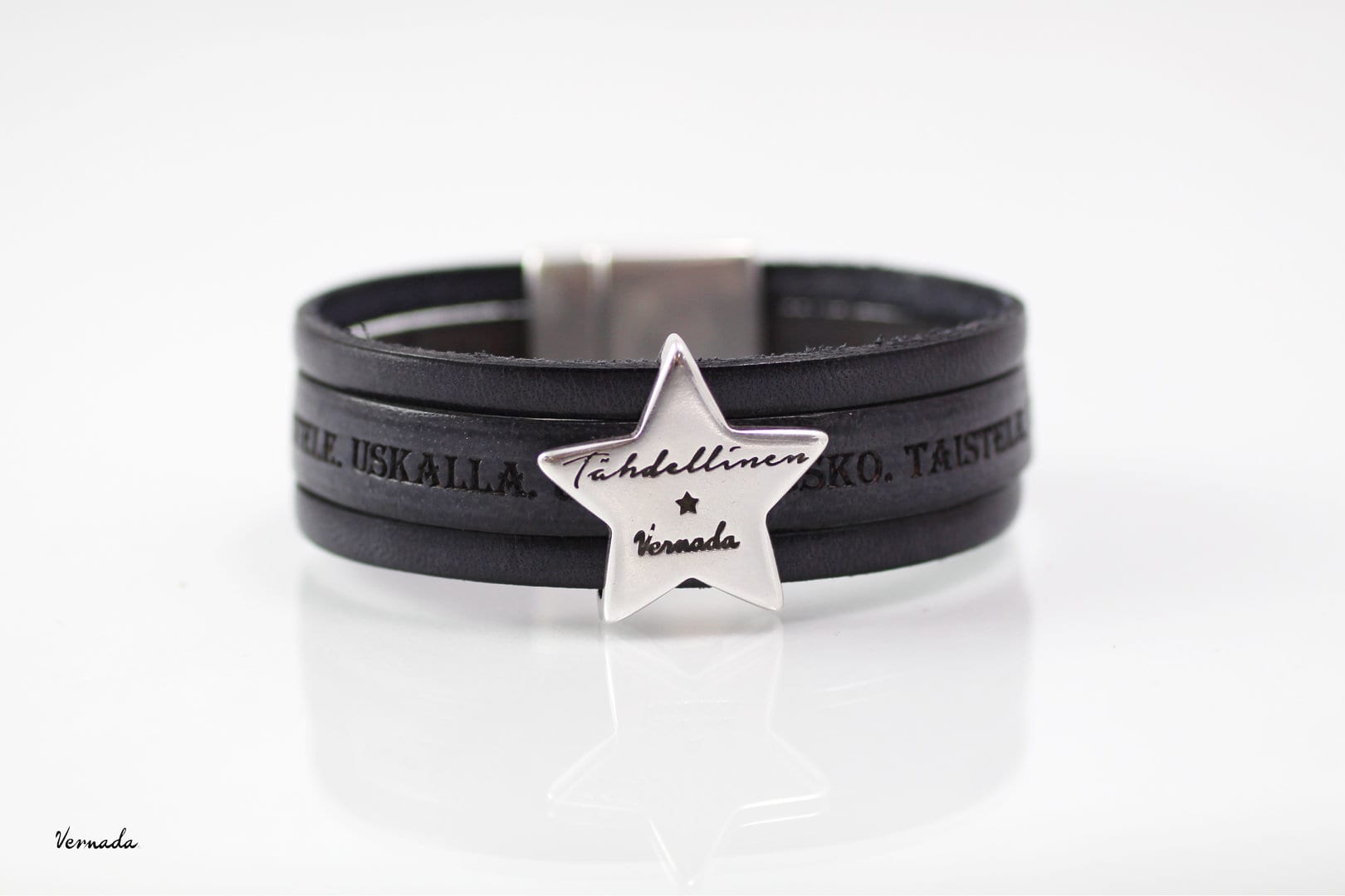 Yksinkertaisen tyylikäs magneettilukollinen nahkarannekoru, jossa yksityiskohtana Tähdellinen–koristehela. Korussa on kolme nahkanauhaa, keskimmäisessä nauhassa lukee hyvät voimasanat UNELMOI. USKO. TAISTELE. USKALLA. Koru kiinnitetään napakalla hopeoidulla magneettilukolla. Korun leveys on lukon kohdalta 23 mm. Unisex-malli sopii niin miehelle kuin naisellekin.